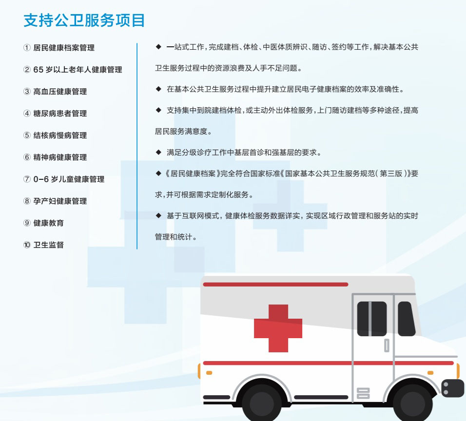 支持國家公衛(wèi)體檢,《居民健康檔案》完全符合國家標準《國家基本公共衛(wèi)生服務規(guī)范(第三版)》要求。